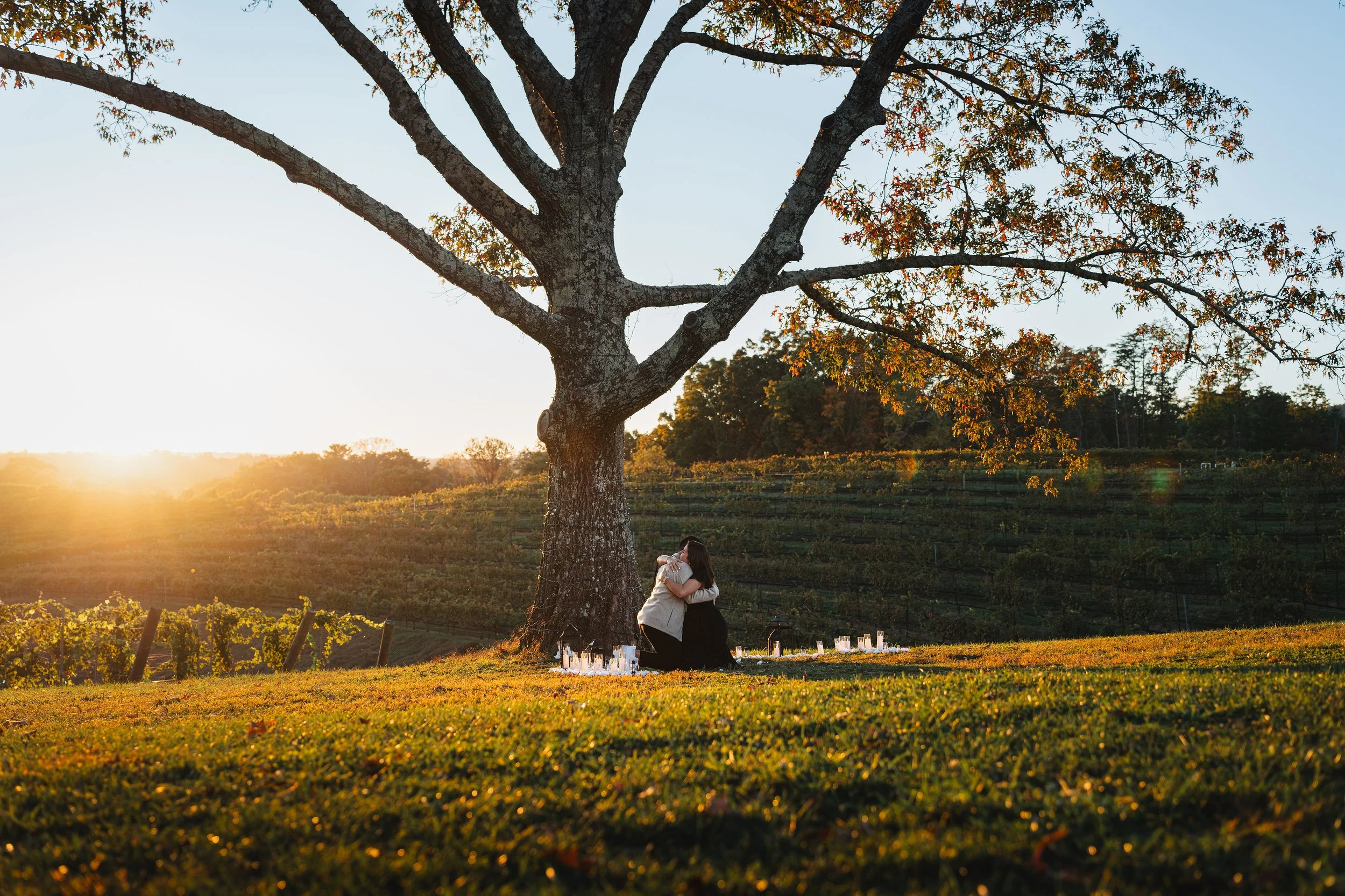 Set against the rolling hills and vineyards of Montaluce, Camilo’s proposal felt both intimate and scenic. The winery’s Italian-inspired architecture on the hill added a unique charm to the day. Under the large oak tree, friends and family had arranged candles and white roses, creating a peaceful spot for the proposal. The tree’s wide branches framed the scene perfectly, blending with the beauty of the surrounding landscape.